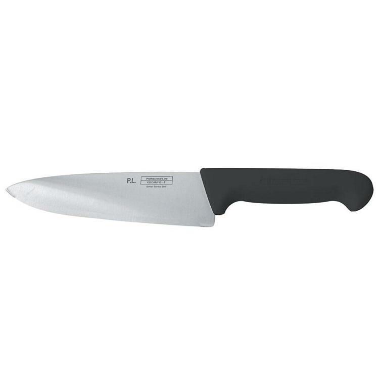 Нож поварской с чёрной ручкой P.L. Proff Cuisine PRO-Line KB-3801-300-BK201-RE-PL, используется для нарезки различных продуктов, таких как мясо, рыба, овощи и фрукты.