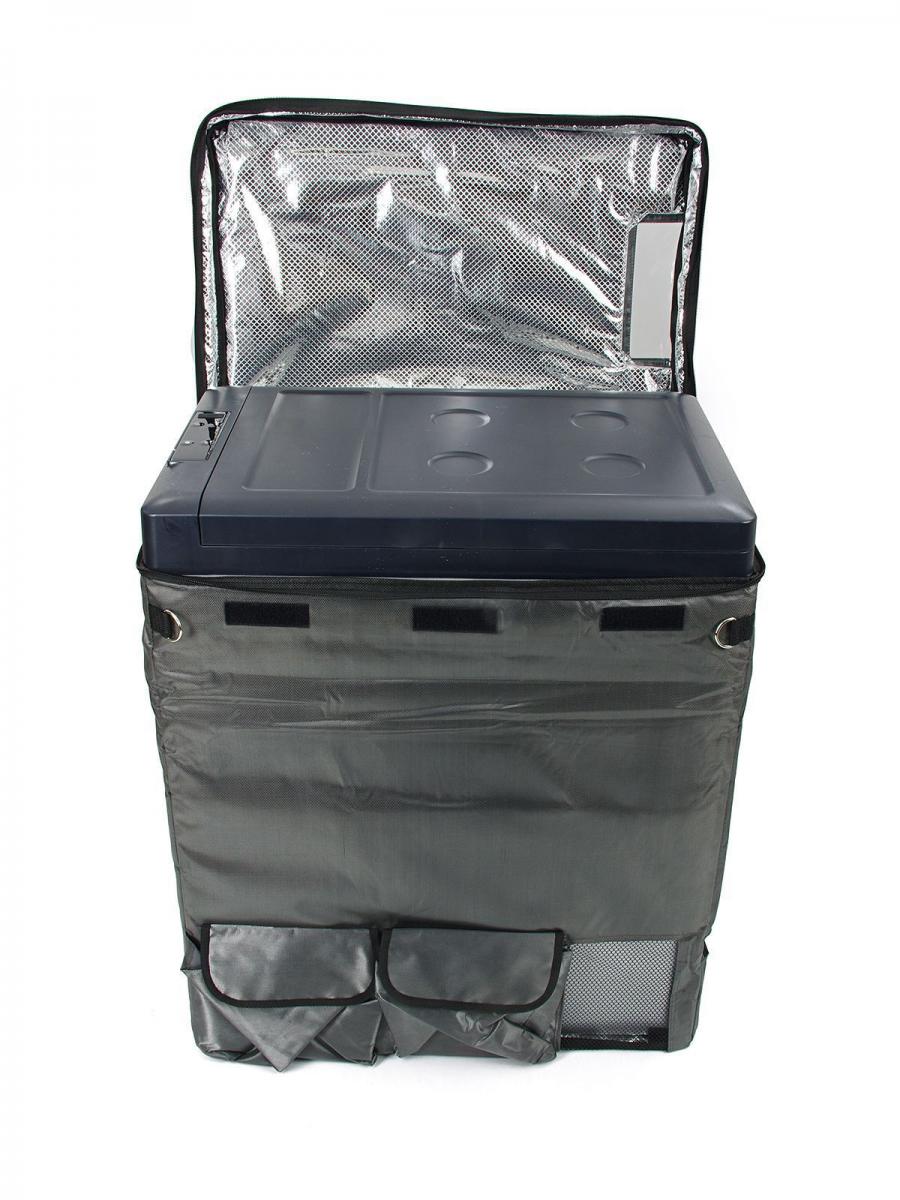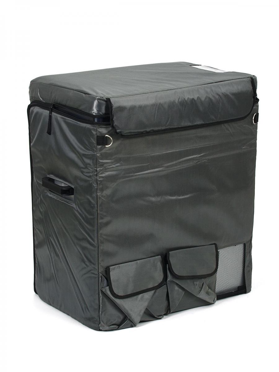 Защитный термочехол на автохолодильник C25 повышает КПД и предохраняет от царапин. Спереди расположены два кармана, в которых с легкостью умещается внешняя батарея или другие предметы владельца.