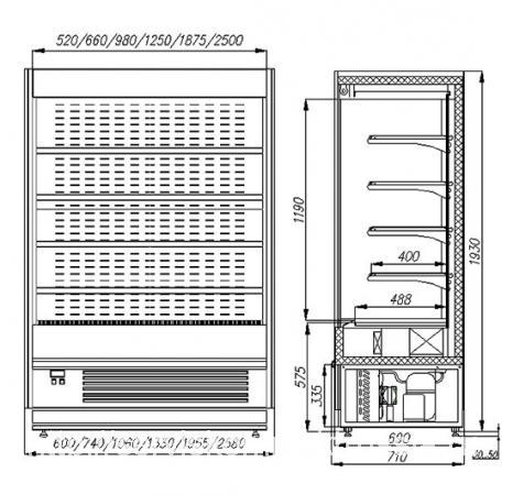 Длина: 600 мм Ширина: 710 мм Высота: 1930 мм Рабочие температуры: -5…+5 °C Страна: Россия Способ установки: пристенный Тип горки: Универсальная Тип агрегата: Встроенный Напряжение: 220 В Тип охлаждения: Динамическое(Вентилируемое) Наличие вентилятора у конденсатора: есть Количество полок: 4 шт. . Подсветка: вертикальная, LED - лента Хладагент: R404а Площадь экспозиции: 1.05 м2