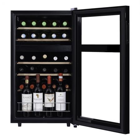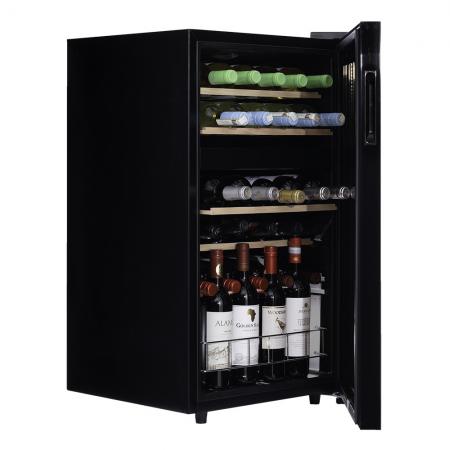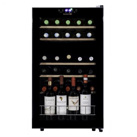 Компрессорный винный шкаф Dunavox DXFH-30.80 Инженеры компании Dunavox разработали новую модель отдельностоящего винного шкафа DXFH-30.80. Модель идеально вписывается в любой подходящий для Вас интерьер гостиной кухни, бара или кабинета. Двойное стекло с защитой от прямых УФ-лучей поддерживает качественные условия хранения вина. Компрессорный винный шкаф Dunavox DXFH-30.80 обладает средней вместимостью и способен разместить в себе до 30 бутылок. Располагаются они на выдвижных полках из массива бука. Внутреннее пространство шкафа имеет две температурные зоны с возможностью настраивать каждую из них в диапазоне от +5 °C до +18°C. Электронный термостат помогает стабильно поддерживать заданную Вами температуру. Холодильник поддерживает влажность в диапазоне 60-80%, как в настоящем винном погребе. Лаконичный дизайн шкафа придаёт интерьеру современный вид. Дополнительно у данной модели предусмотрен демонстрационный режим, во время которого освещение не гаснет. Такая функция помогает демонстрировать винную коллекцию Вашим друзьям и близким. Используется освещение синего цвета, которое обеспечивает равномерную подсветку всех полок. (Освещение плавно включается при открывании дверцы, а через пару секунд после закрытия плавно гаснет.) Удобное и понятное сенсорное управление, исключает вероятность случайного нажатия. Винный шкаф DXFH-30.80 – современное решение в вопросе хранения вин. Отличительные особенности Элегантный дизайн Две температурные зоны Затемненное стекло с УФ-фильтром Светодиодное освещение Плавное включение и выключение освещения Класс энергоэффективности G Сенсорное управление Демонстрационная полка Блокировка панели управления Dunavox оставляет за собой право изменять параметры без предварительного уведомления.