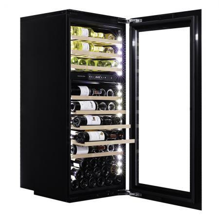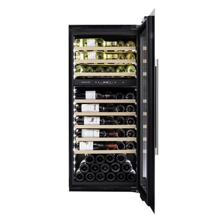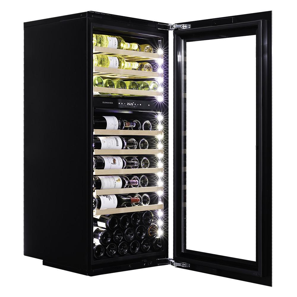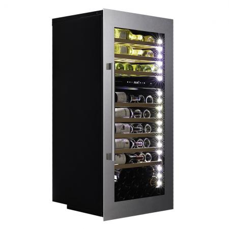 Компрессорный винный шкаф Dunavox DAVS-72.185DSS Инженеры компании Dunavox разработали новую модель встраиваемого винного шкафа DAVS-72.185DSS. Установить его можно в нишу или колонну Вашего мебельного гарнитура. Модель идеально вписывается в любой подходящий для Вас интерьер гостиной кухни, бара или кабинета. В качестве дополнительной функции, производители Dunavox разработали реверсивную дверь. Это поможет разместить шкаф в удобном для Вас месте или расположить две модели рядом, создав технологию открытия side-by-side. Тройное стекло с защитой от прямых УФ-лучей поддерживает качественные условия хранения вина. Встроенная система вентиляции создаёт необходимую циркуляцию воздуха для правильной работы винного холодильника Компрессорный винный шкаф Dunavox DAVS-72.185DSS обладает большой вместимостью и способен разместить в себе до 72 бутылок. Располагаются они на выдвижных полках из массива бука. Внутреннее пространство шкафа разделено на 2 температурные зоны с возможностью настраивать каждую из них в диапазоне от +5 °C до +20 °C. Электронный термостат помогает стабильно поддерживать заданную Вами температуру. Холодильник поддерживает влажность в диапазоне 60-80%, как в настоящем винном погребе. Для дополнительного повышения влажности предусмотрен контейнер для дистиллированной воды. Наличие «Зимнего режима» даёт возможность повысить температуру внутри шкафа, если температура в помещении упала ниже установленной для хранения вина. Лаконичный дизайн шкафа придаёт интерьеру современный вид. Чёрный корпус и рамка из бесшовной нержавеющей стали добавляют элегантности и солидности. В этой модели использовано панорамное освещение синего, янтарного и белого цвета, которое обеспечивает равномерную подсветку всех полок. (Освещение плавно включается при открывании дверцы, а через пару секунд после закрытия плавно гаснет.) Дополнительно у данной модели шкафа предусмотрен демонстрационный режим, во время которого освещение не гаснет. Такая функция помогает демонстрировать винную коллекцию Вашим друзьям и близким. Удобное и понятное сенсорное управление, исключает вероятность случайного нажатия. Встроенный автодоводчик обеспечивает мягкое закрывание двери. Если Вы забыли или не до конца закрыли шкаф – сигнализатор двери оповестит об этом. Для людей, соблюдающих религиозные обычаи предусмотрен режим «Шаббат» (суббота). При этом режиме отключается освещение, дисплей и звуковые сигналы при нажатии на кнопки. Винный шкаф DAVS-72.185DSS – современное решение в вопросе хранения вин. Отличительные особенности Две температурные зоны Дверца из бесшовной нержавеющей стали Перенавешиваемая дверь Регулирование чувствительности дверного сенсора Сигнализатор открытой двери Затемненное стекло с УФ-фильтром Панорамное освещение Плавное включение и выключение освещения Режим «ШАББАТ» Зимний режим Класс энергоэффективности G Демонстрационная полка Сенсорное управление Встроенная система вентиляции Вентилируемые зоны Dunavox оставляет за собой право изменять параметры без предварительного уведомления.