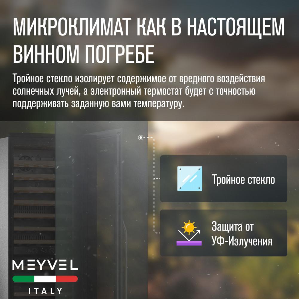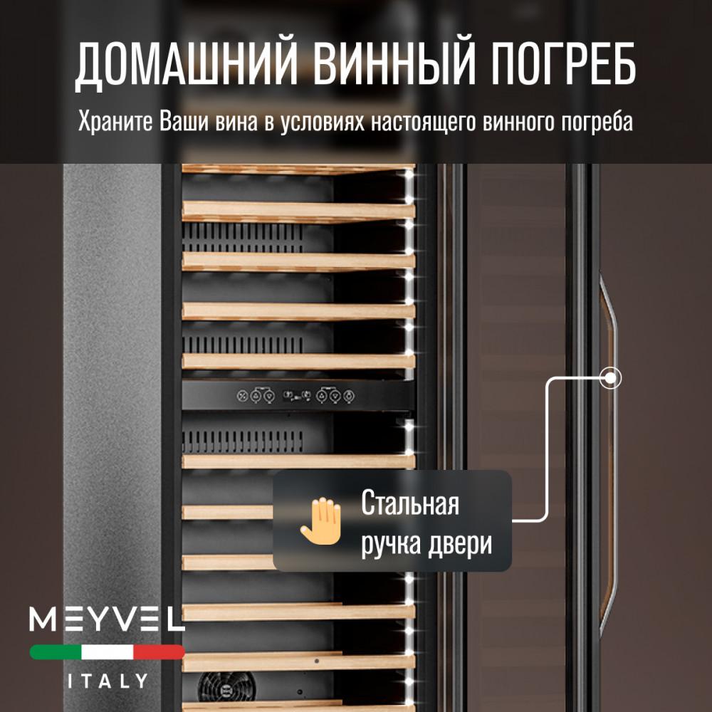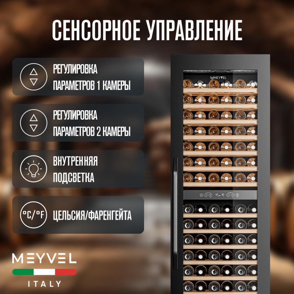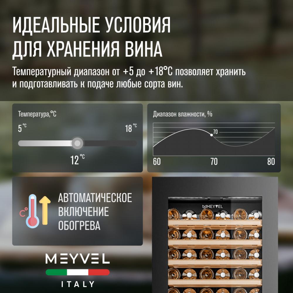 Винный шкаф Meyvel MV83-KBB2 Модель MV83-KBB2 имеет привлекательный внешний вид, сочетающий в себе неподвластное времени очарование натуральных материалов с высокотехнологичными системами сохранения продуктов. Встраиваемый винный холодильник Meyvel MV83-KBB2 оснащен дверью с защитой от ультрафиолетовых лучей и отлично подойдет для хранения и созревания различных сортов вин. Динамическая система охлаждения обеспечивает оптимальную температуру для вина и сохраняет необходимую влажность внутри камеры. Универсальный микроклимат Компрессорный винный шкаф Meyvel MV83-KBB2 обладает большой вместимостью и способен разместить до 96 бутылок. Располагаются они на полках из массива бука. Внутреннее пространство шкафа разделено на 2 температурные зоны с возможностью настраивать каждую из них. Общий температурный диапазон от +5°C до +18°C. Холодильник поддерживает влажность в диапазоне 60-80%, как в настоящем винном погребе. Электронный дисплей Быстро задавайте необходимую температуру для содержимого и управляйте всеми функциями холодильника с помощью интуитивно-понятного расположения кнопок на электронном дисплее. Преимущества винного шкафа Meyvel MV83-KBB2: Вместимость 96 бутылки 0,75 л; Температура верхней зоны от +5°C до +18°C; Температура нижней зоны от +10°C до +18°C; Наличие угольного фильтра; Память настроек; Удобное электронное управление; Внутренний вентилятор, отдельный для каждой зоны, позволяет равномерно распределять температуру.; Тройное стекло с УФ-фильтром; Встраивается в нишу; Выдвижные полки из массива бука. Обратите внимание: прежде чем устанавливать винный шкаф, ознакомьтесь с указанными в инструкции показателями напряжения (В) и частоты (Гц) и убедитесь в том, что они совпадают с уровнем показателей в Вашем доме; не наклоняйте винный шкаф более чем на 45°; не устанавливайте винный шкаф вблизи с нагревающимися электроприборами, а также в зоне прямого попадания солнечных лучей; после установки винного шкафа необходимо проверить, насколько ровно Вы настроили ножки, потому как использование винного шкафа, установленного под углом, может привести к поломке дверцы. Meyvel оставляет за собой право изменять параметры без предварительного уведомления.